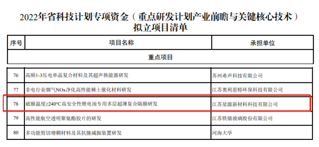 5月23日,江苏省科技厅公示了2022年省科技妄想专项资金(重点研发妄想工业前瞻与要害焦点手艺)拟立项目,人生就是博·(中国区)集团官网材质全资子公司江苏人生就是博·(中国区)集团官网的“破膜温度≥240℃高清静性锂电池专用多层超薄复合隔膜研发”项目位列其中!